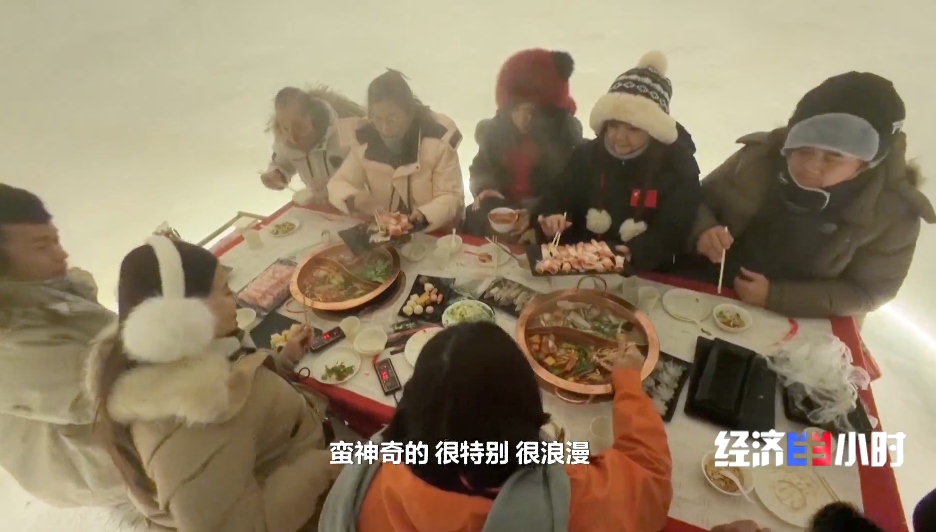 游客們在冰天雪地里漂上一程,一上岸,就奔向特色雪屋。在這里享用熱氣騰騰的火鍋,體驗(yàn)“冰火兩重天”的樂趣。