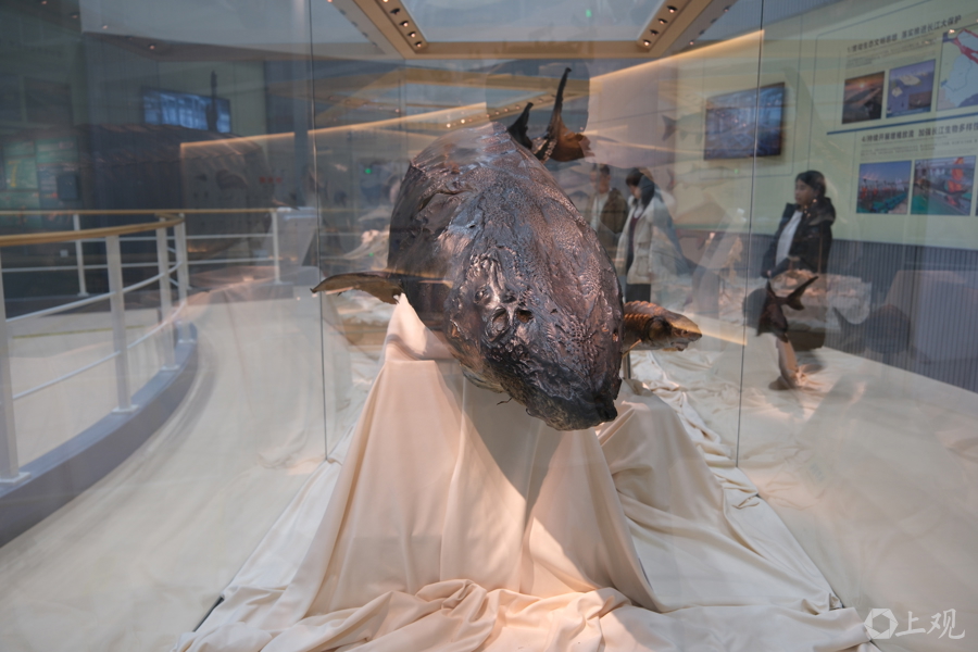 水野中心內(nèi)科普館的“鎮(zhèn)館之寶”,是一尾中華鱘標(biāo)本。它長(zhǎng)3.5米,重350公斤。2007年7月17日在金山區(qū)杭州灣水域誤入漁網(wǎng)受傷,經(jīng)全力救治成功存活1232天,在2010年12月1日死亡,創(chuàng)下當(dāng)時(shí)國(guó)內(nèi)搶救救治中華鱘最長(zhǎng)存活紀(jì)錄 郜陽(yáng) 攝