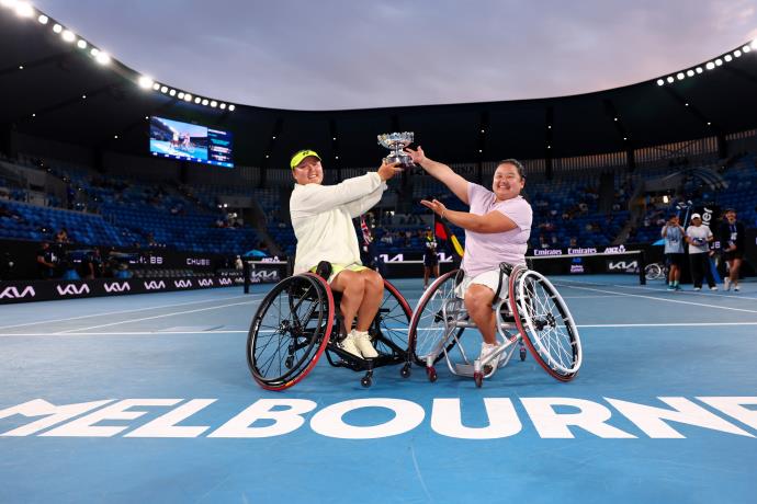 北京時間1月30日,2026澳網(wǎng)輪椅網(wǎng)球女雙決賽,頭號種子、中國組合王紫瑩/李曉輝以6-4、6-3擊敗2號種子朱珍珍/上地結(jié)衣,實(shí)現(xiàn)衛(wèi)冕。中國選手朱珍珍和搭檔上地結(jié)衣收獲亞軍。
