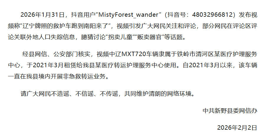 中國網(wǎng)2月2日訊 據(jù)“新野發(fā)布”微信公眾號消息,2月2日上午,河南省南陽市新野縣委網(wǎng)信辦發(fā)布情況說明稱,2026年1月31日,抖音用戶“MistyForest_wander”(抖音號:48032966812)發(fā)布視頻稱“遼寧牌照的救護車跑到南陽來了”,視頻引發(fā)廣大網(wǎng)民關(guān)注和評論,部分網(wǎng)民在評論區(qū)評論關(guān)聯(lián)外地人口失蹤信息,臆猜討論“拐賣兒童”“販賣器官”等話題。