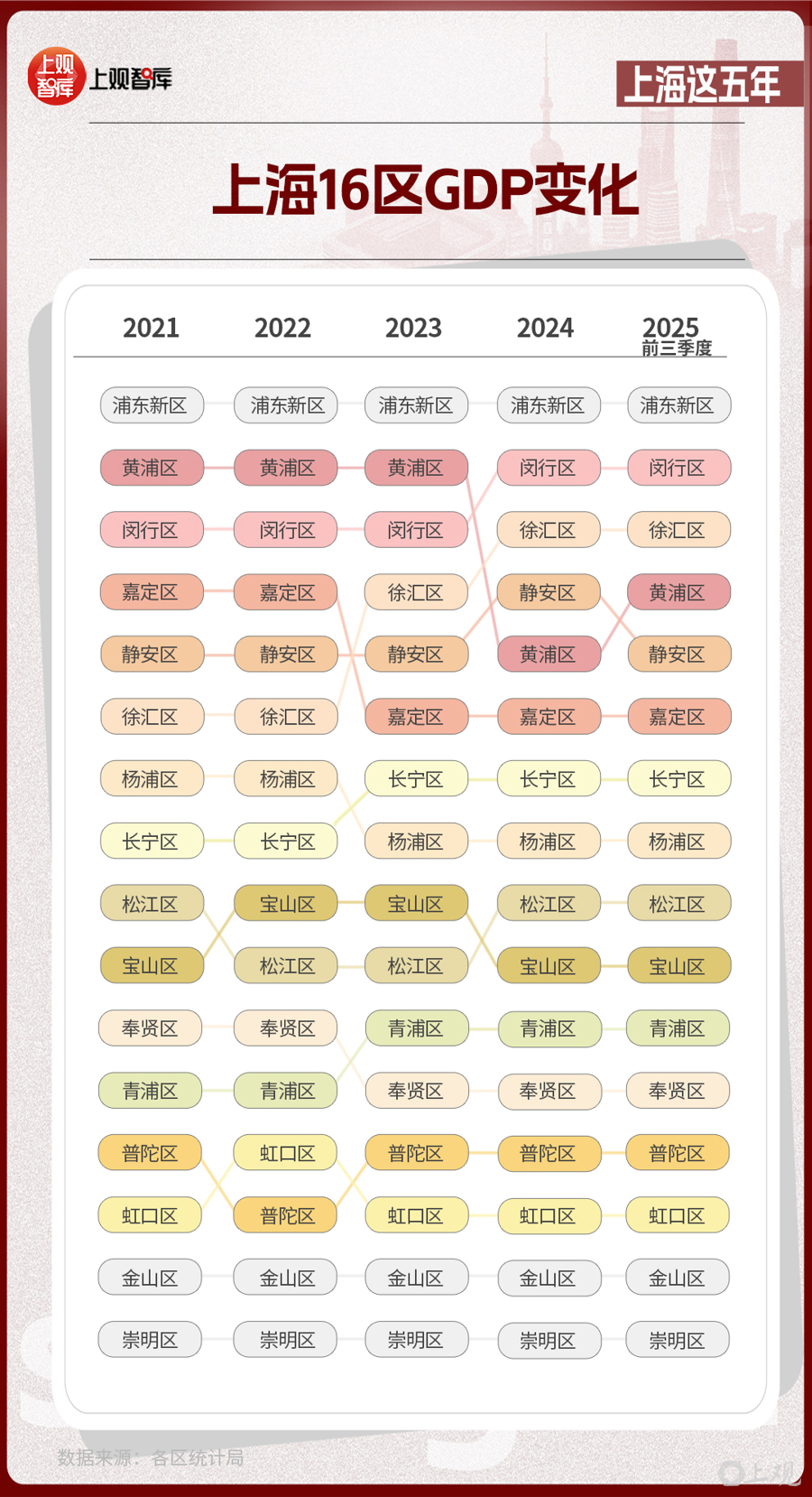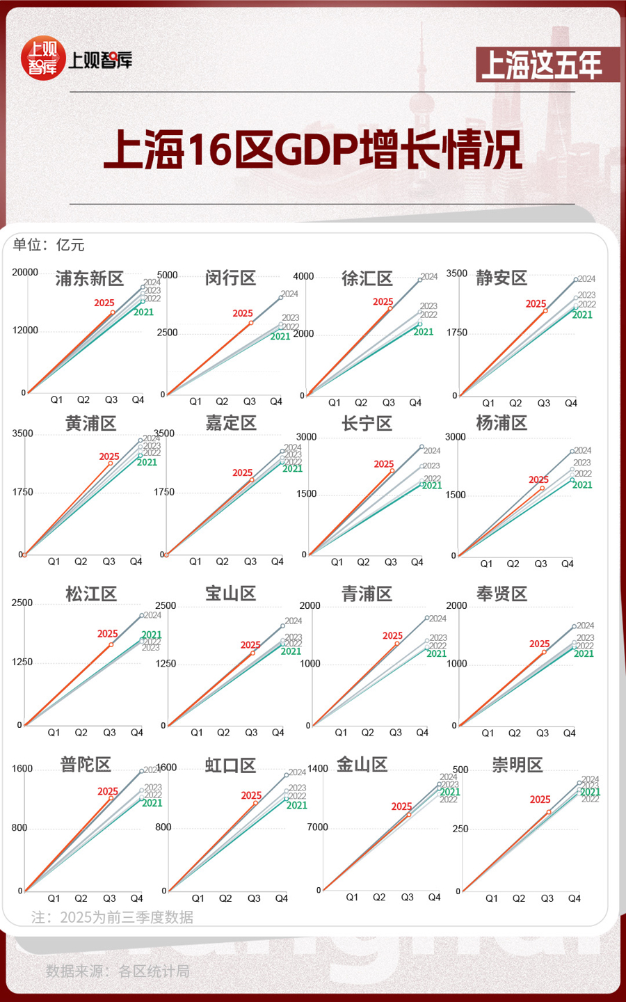 區(qū)域?qū)用?,上?6區(qū)GDP的變化,體現(xiàn)出從中心向多極擴(kuò)散的趨勢(shì)。2021年,浦東新區(qū)GDP占全市近36%,而到了2025年,這一比重下降至約33%。其他區(qū)在這五年間,充分發(fā)揮自身優(yōu)勢(shì),齊頭并進(jìn),為上海發(fā)展創(chuàng)造了更多增長極。