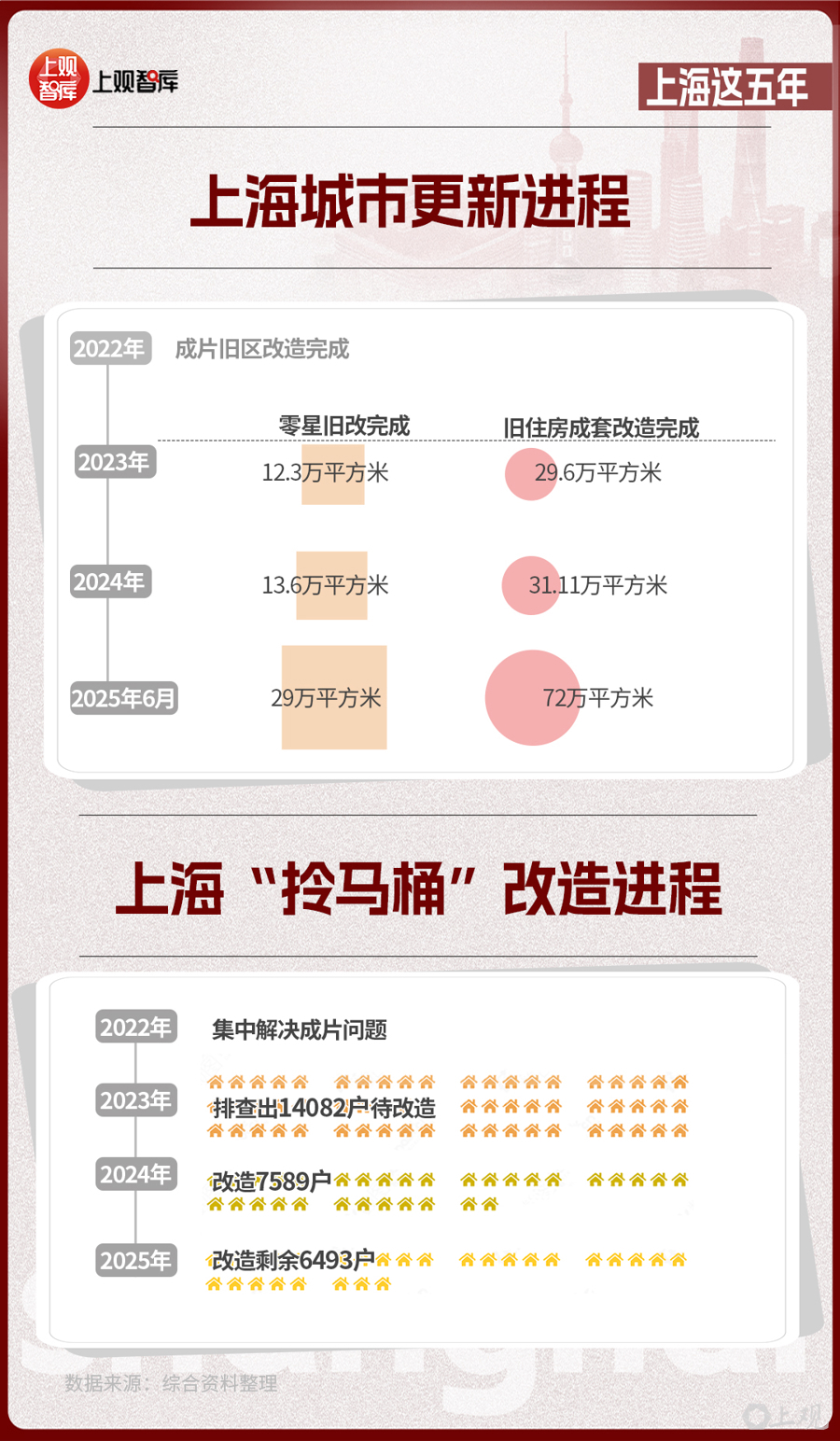 2022年,上海市成片舊區(qū)改造完成;此后,上海加力推進(jìn)“兩舊一村”改造。2023年到2025年6月底,零星舊改完成約29萬平方米,舊住房成套改造完成約72萬平方米,城中村改造認(rèn)定44個(gè)項(xiàng)目,完成老舊小區(qū)改造3910萬平方米,提前完成舊改核心任務(wù)。