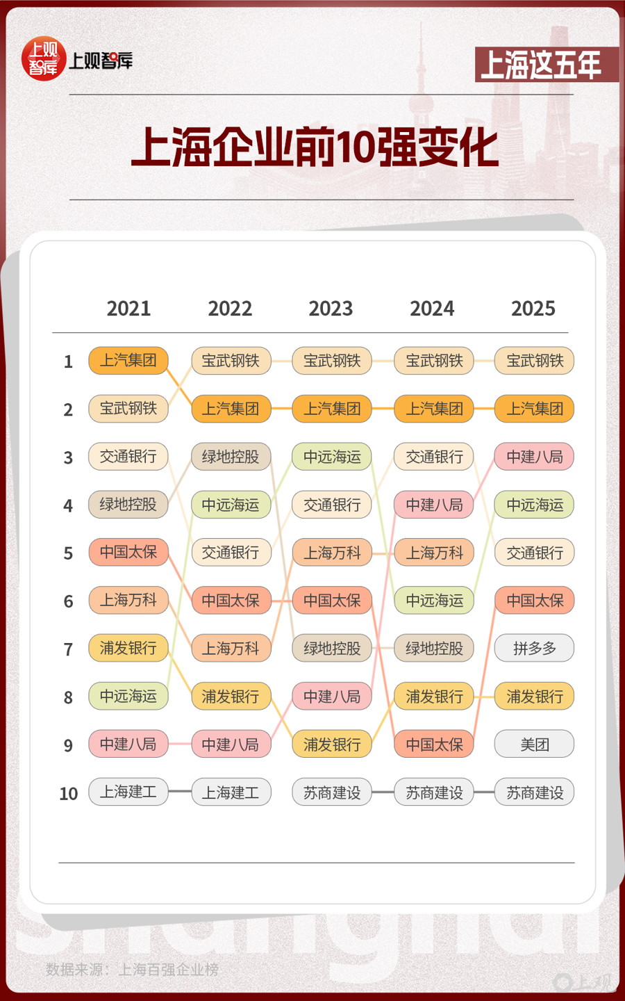 這份由上海市企業(yè)聯(lián)合會(huì)、上海市企業(yè)家協(xié)會(huì)、上海市經(jīng)濟(jì)團(tuán)體聯(lián)合會(huì)和解放日?qǐng)?bào)社共同發(fā)布的榜單,從2021年到2025年,見證了傳統(tǒng)企業(yè)的轉(zhuǎn)型與創(chuàng)新企業(yè)的涌現(xiàn)。在前10強(qiáng)的名單中,制造業(yè)仍然是上海產(chǎn)業(yè)的壓艙石,而房地產(chǎn)、建筑企業(yè)從2021年占比達(dá)40%,到2025年占比降低為20%?;ヂ?lián)網(wǎng)企業(yè)在2025年沖上前10強(qiáng),并占據(jù)了20%的席位,亮出了上海經(jīng)濟(jì)多元發(fā)展的成績單。