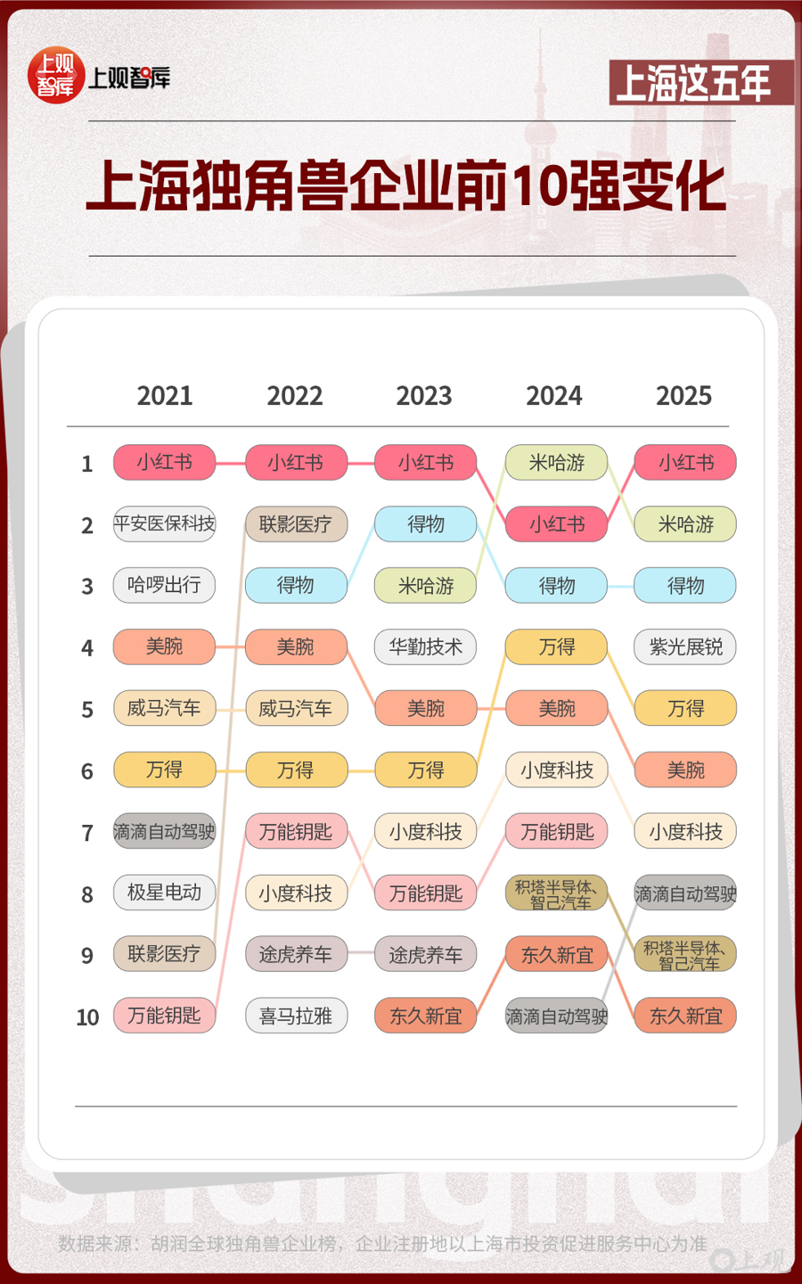 前10位的上海獨(dú)角獸企業(yè),從2021年到2025年,發(fā)生了不小的改變。有的企業(yè)已經(jīng)上市,如聯(lián)影醫(yī)療、華勤技術(shù)等;有的企業(yè)悄然退場(chǎng);有的企業(yè)仍持續(xù)霸榜,如小紅書、米哈游、得物、美腕、萬得。獨(dú)角獸企業(yè)的變動(dòng)與產(chǎn)業(yè)趨勢(shì)息息相關(guān)。當(dāng)新能源汽車產(chǎn)業(yè)進(jìn)入高質(zhì)量發(fā)展的階段時(shí),智己汽車接過領(lǐng)軍大旗;在AI芯片成為市場(chǎng)熱點(diǎn)時(shí),積塔半導(dǎo)體、紫光展銳已躋身芯片新勢(shì)力代表之列。