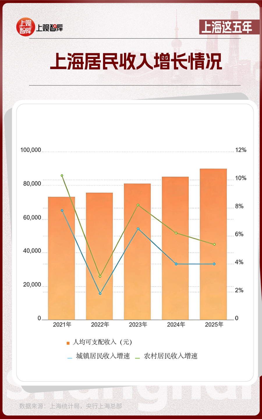 2025年,上海人均可支配收入超過了9萬元,對(duì)比2021年增長了17.9%;人均消費(fèi)支出逼近5.5萬元,對(duì)比2021年增長了12.0%;全市社會(huì)消費(fèi)品零售總額增長4.6%。
