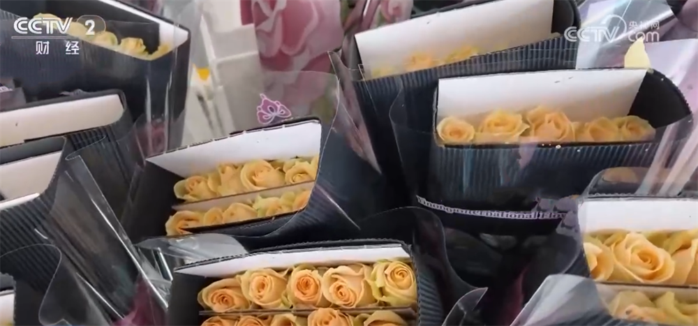 商家介紹,本月出口鮮花的發(fā)貨量是日常的五倍,目前訂單已經(jīng)排到年后。新鮮采摘的鮮花在出口商車間完成分揀、包裝、保鮮等處理后,由冷鏈送往機(jī)場(chǎng)過關(guān)出口,整個(gè)流程最快不到20小時(shí)就能完成。
