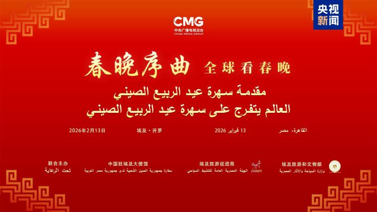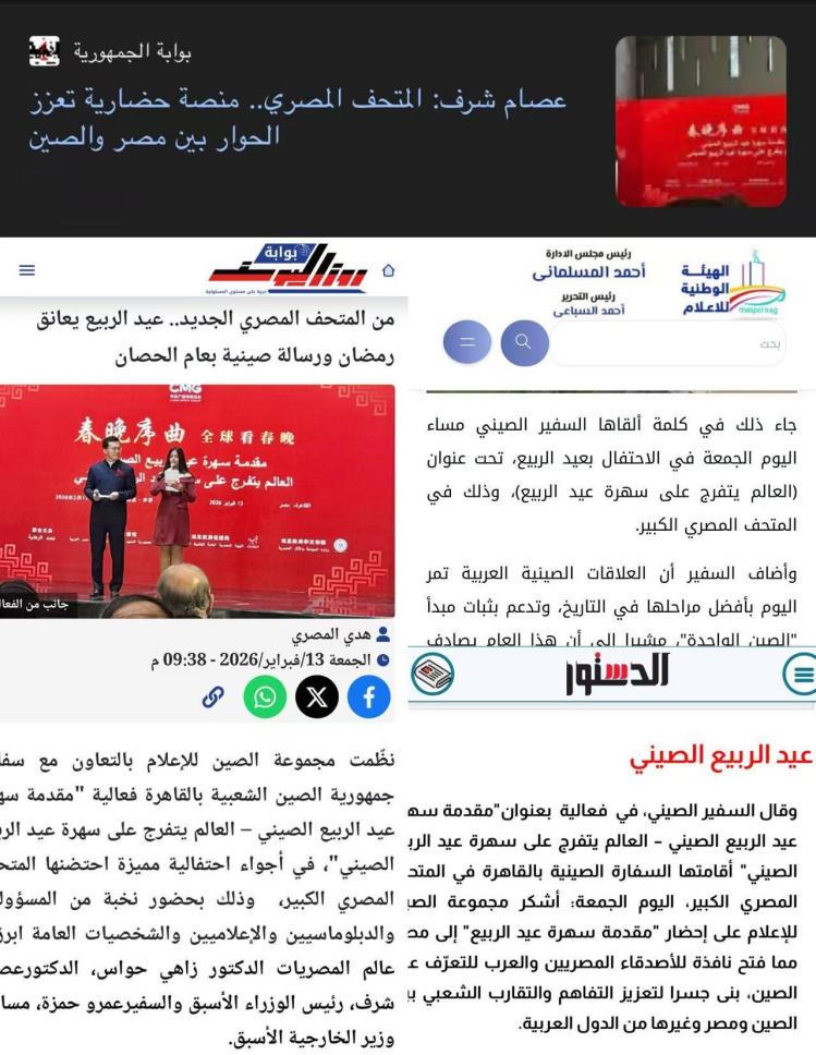 當(dāng)?shù)貢r(shí)間2月13日,“春晚序曲 全球看春晚”埃及專場活動(dòng)在開羅舉行。本次活動(dòng)由中國中央廣播電視總臺與中國駐埃及大使館、埃及旅游和文物部、埃及旅游促進(jìn)局共同主辦。中宣部副部長、中央廣播電視總臺臺長慎海雄作視頻致辭。中國駐埃及大使兼駐阿盟全權(quán)代表廖力強(qiáng),埃及政府代表、埃及外交部亞洲事務(wù)部助哈姆扎,埃及前總理沙拉夫出席活動(dòng)并致辭。埃及考古學(xué)家、前文物部長哈瓦斯,埃及旅游促進(jìn)局主席代拉提芙,埃及外交事務(wù)委員會執(zhí)行主任伊扎特,巴德爾大學(xué)副校長巴斯歐尼,阿盟非洲事務(wù)司司長布斯坦吉,阿盟理事會秘書處主任法赫米等中埃兩國政界、學(xué)術(shù)界、媒體界代表200余名嘉賓參加活動(dòng)。