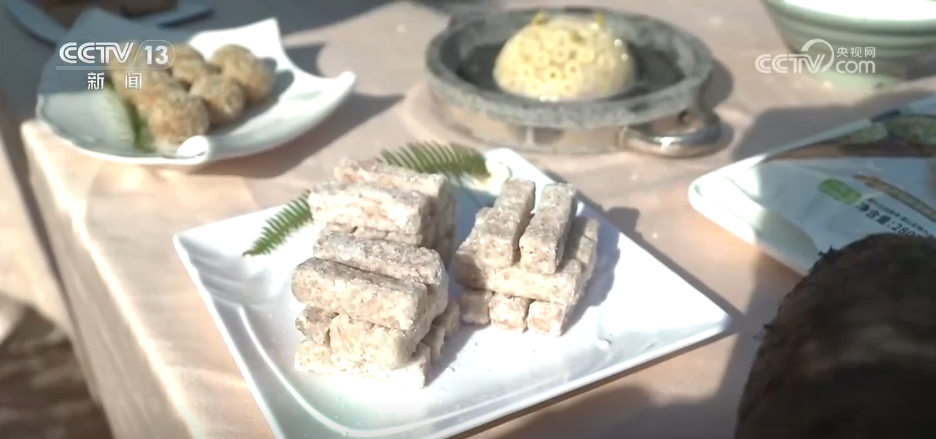 除了好看,當(dāng)然也有好吃的。當(dāng)?shù)氐募t糖年糕寓意著“年年高、步步高”。還有一道是用本地檳榔芋做成的掛霜芋,將芋塊加入白糖翻炒,表面裹上一層細(xì)細(xì)的糖霜,粉粉糯糯,是每家每戶逢年過節(jié)的必備菜肴。