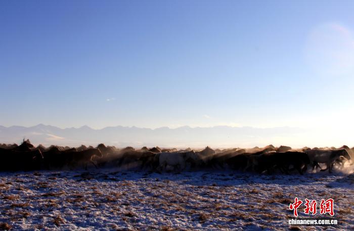 新疆巴音布魯克草原上的萬(wàn)馬踏雪壯景。史玉江 攝