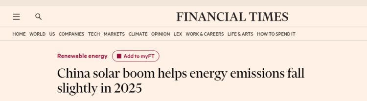 英國(guó)《金融時(shí)報(bào)》日前發(fā)文稱,2025年,太陽能的蓬勃發(fā)展促使中國(guó)的碳排放量有所下降。
