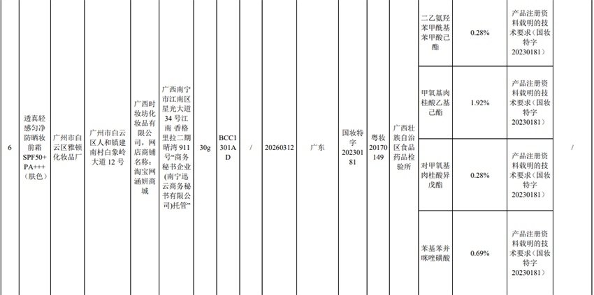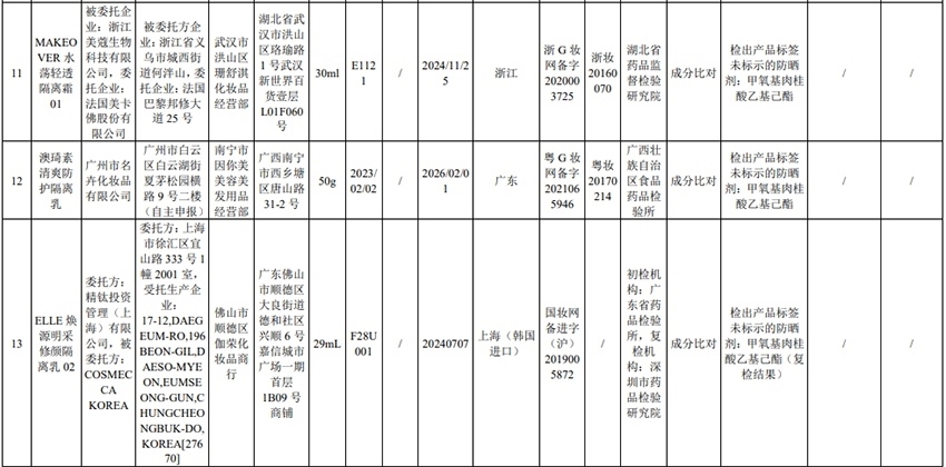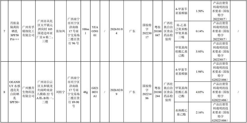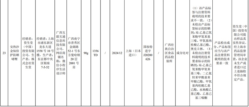 記者注意到,其中,產(chǎn)品標(biāo)簽標(biāo)示為歐萊雅(中國)有限公司生產(chǎn)的蘭蔻輕透水漾防曬乳(標(biāo)示批號(hào):78W200)“未檢出產(chǎn)品標(biāo)簽及注冊(cè)資料載明的技術(shù)要求標(biāo)示的防曬劑”;產(chǎn)品標(biāo)簽標(biāo)示為朋友(上海)化妝品銷售有限公司進(jìn)口的普柔瑪絲特染發(fā)膏(配合普蓉斯綈雙氧乳)(標(biāo)示批號(hào):7X15)“檢出產(chǎn)品標(biāo)簽及注冊(cè)資料載明的技術(shù)要求未標(biāo)示的染發(fā)劑”;產(chǎn)品標(biāo)簽標(biāo)示為資生堂(中國)投資有限公司經(jīng)銷的安熱沙金燦倍護(hù)防曬啫喱(標(biāo)示批號(hào):1356TD)“產(chǎn)品標(biāo)簽與注冊(cè)資料載明的技術(shù)要求不一致”、“未檢出產(chǎn)品標(biāo)簽標(biāo)示的防曬劑”、“未檢出注冊(cè)資料載明的技術(shù)要求標(biāo)示的防曬劑”。