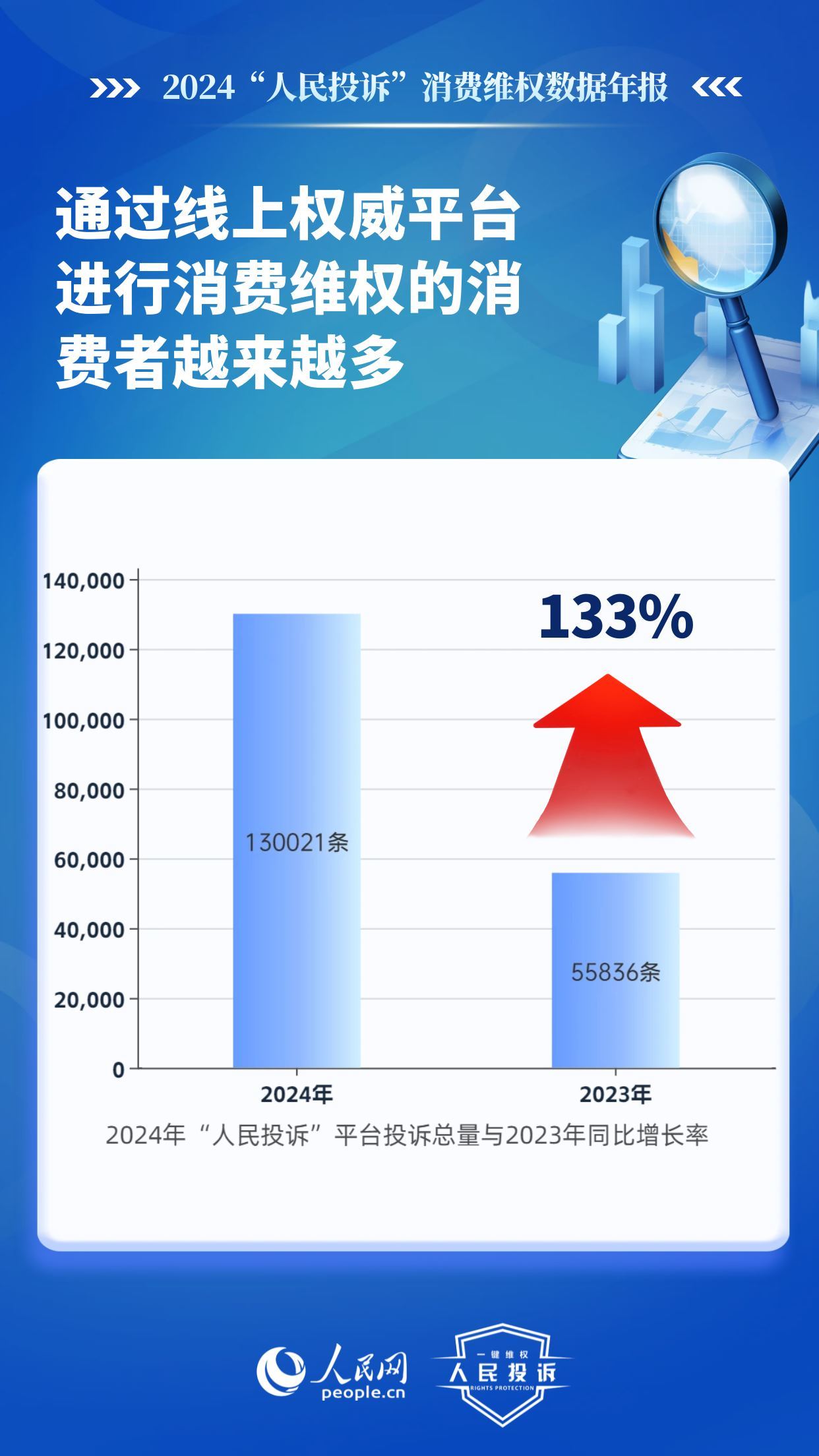 “人民投訴”數(shù)據(jù)顯示,2024年1月1日以來,平臺共收到投訴130021件,投訴量同比增加133%,有效投訴涉及金額1100余萬元。這些數(shù)據(jù)顯示,一年來,越來越多的消費(fèi)者通過線上平臺維權(quán),來解決消費(fèi)糾紛。