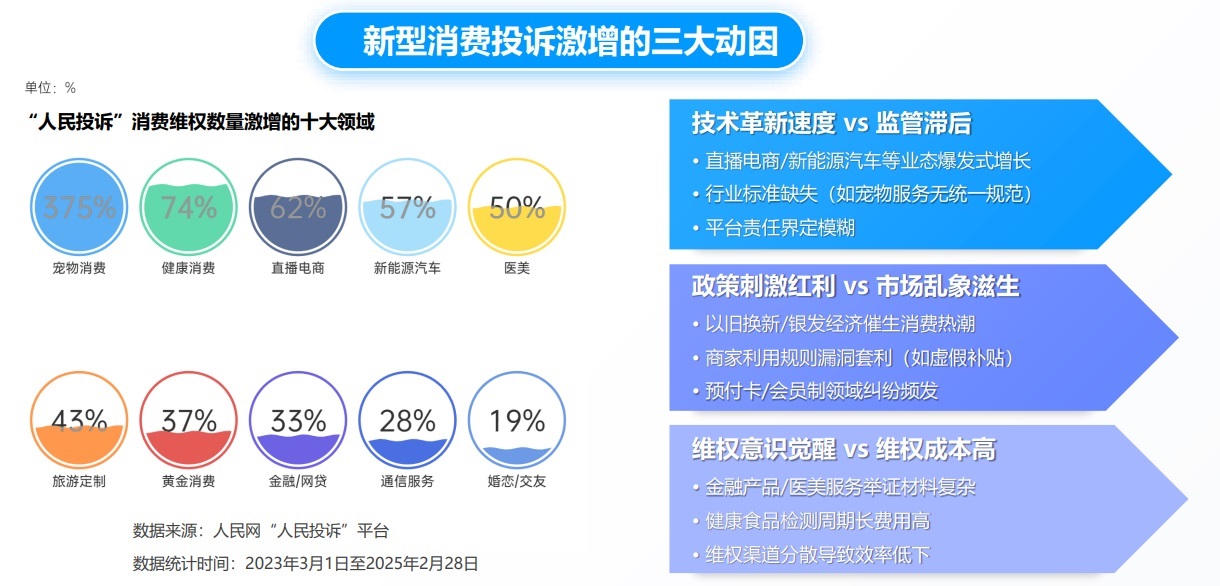 “人民投訴”綜合分析,技術(shù)驅(qū)動(dòng)新業(yè)態(tài)與監(jiān)管未能同步、政策刺激紅利與市場(chǎng)亂象并存、維權(quán)意識(shí)提升與維權(quán)成本矛盾這三大因素共同成為推高新型消費(fèi)領(lǐng)域風(fēng)險(xiǎn)的原因。