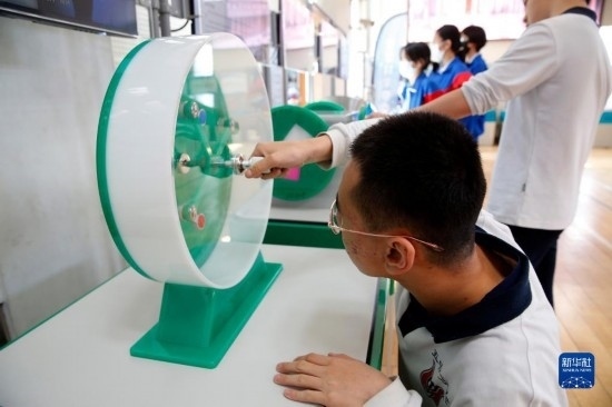 3月29日,中學(xué)生在校園流動科普巡展中體驗趣味科學(xué)裝置。