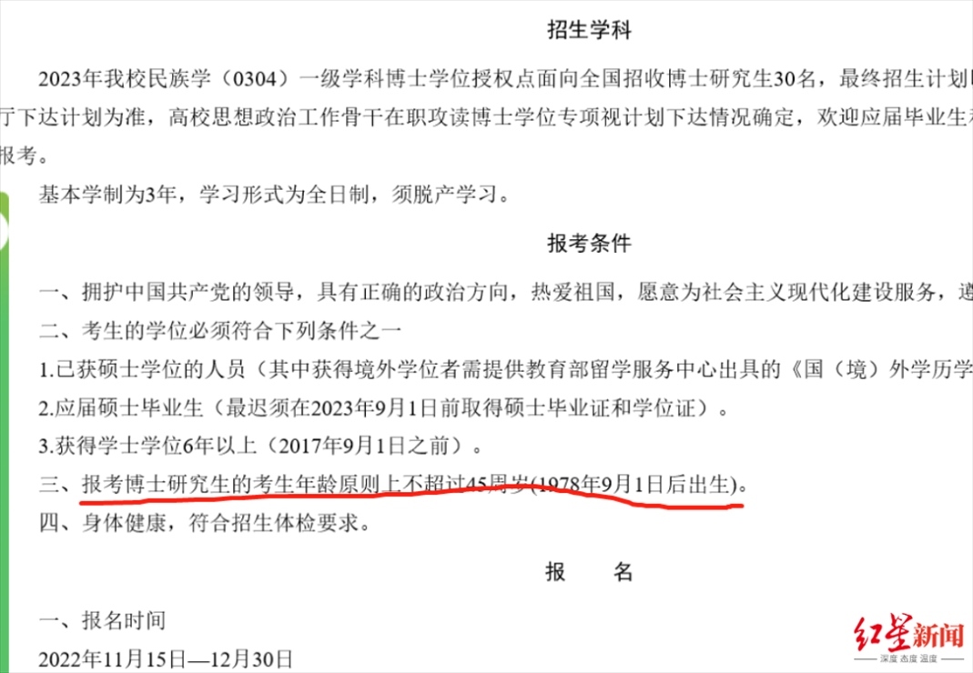 而根據(jù)《青海民族大學2023年民族學博士研究生招生簡章》,報考博士研究生的考生年齡原則上不超過45周歲(1978年9月1日后出生)。資料顯示,阿進錄為1973年出生。對于網(wǎng)友提到的“年齡不符合報考條件”,上述工作人員表示:“他資格審查是通過的。”