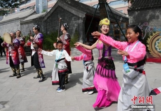 觀看演出時(shí),孩子們與來參加演出的民族藝術(shù)家們共同跳舞。中新社記者 崔楠 攝