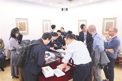 參加“古文字與中華文明”國際學(xué)術(shù)論壇的專家學(xué)者在參觀清華簡。