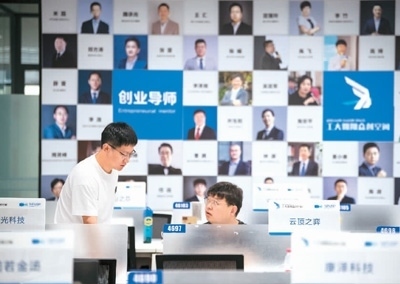 圖為師生在眾創(chuàng)空間開(kāi)放工位上交流。