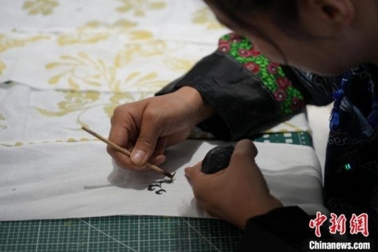 貴州織金苗族蠟染2021年6月入選國務(wù)院公布第五批國家級(jí)非物質(zhì)文化遺產(chǎn)代表性項(xiàng)目名錄?!?5后”苗族女孩王秋雨大學(xué)畢業(yè)后回到織金,成為一名織金苗族蠟染推廣者。她不僅使用傳統(tǒng)小臘刀,還使用大臘刀和毛筆,以蜂蠟為墨在絲巾、衣服、箱包上繪制小篆、甲骨文、山水等文字與圖案,這些蠟染產(chǎn)品深受消費(fèi)者喜愛。圖為6月19日,王秋雨在織金縣平遠(yuǎn)古鎮(zhèn)的依文織金數(shù)字化展廳制作蠟染。周燕玲 攝