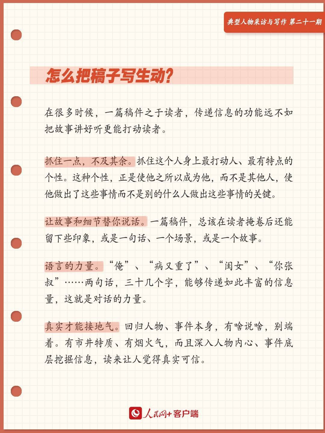 抓住一點(diǎn),不及其余。副縣長、信訪局長、基層民警、環(huán)衛(wèi)局長……這些被評(píng)為“人民滿意的公務(wù)員”的采訪對(duì)象,每個(gè)人身上都有一串光榮事跡,若是有聞必錄,大概寫五六千字也打不住。怎樣在千字內(nèi)把故事講好,讓采訪對(duì)象躍然紙上?