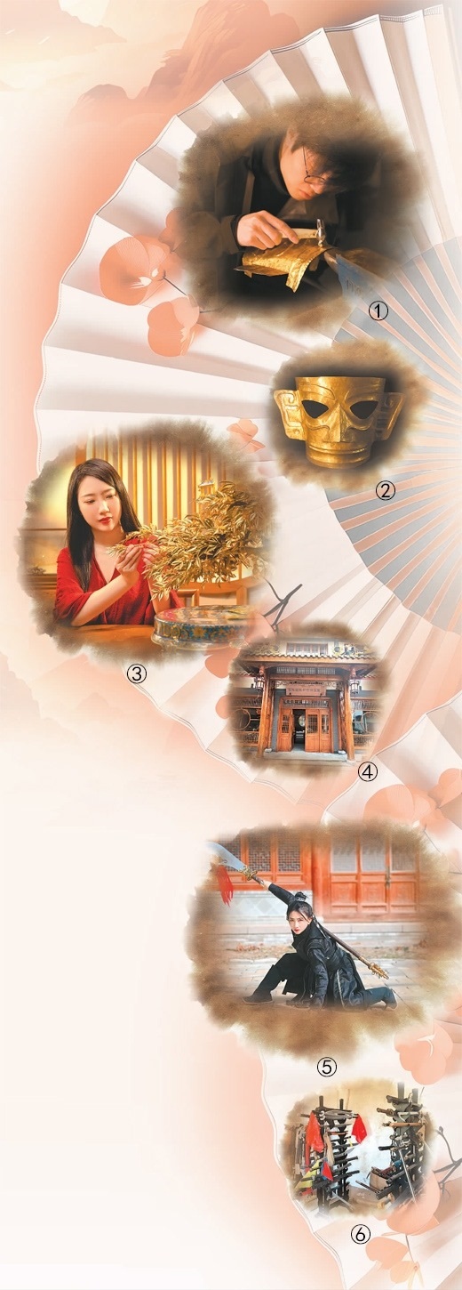 | 圖①:王莘閣在工作。圖②:王莘閣復(fù)刻的三星堆黃金面具。圖③:雁鴻展示她制作的工藝品。圖④:雁鴻國(guó)風(fēng)研習(xí)技藝館。圖⑤:張含亮在進(jìn)行武術(shù)視頻拍攝。圖⑥:張含亮拍攝用的兵器道具。本文照片由受訪者提供潘旭濤制圖 |