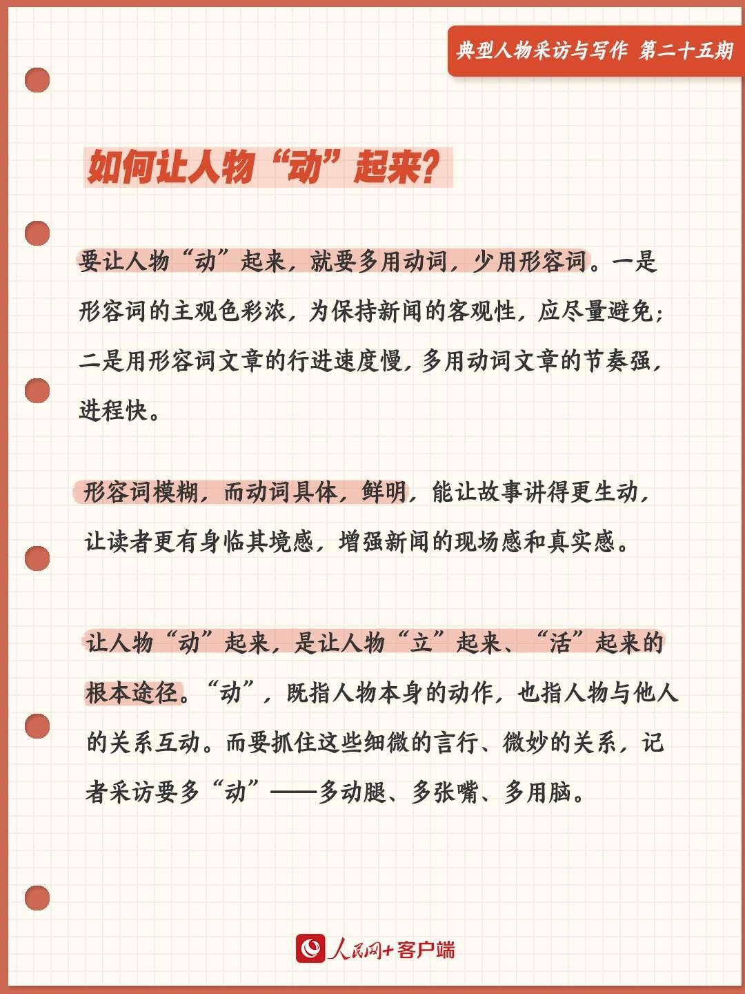 要讓人物“動”起來,就要多用動詞,少用形容詞。為什么?一是形容詞的主觀色彩濃,為了保持新聞的客觀性,應(yīng)盡量避免;二是用形容詞文章的行進速度慢,多用動詞文章的節(jié)奏強,進程快。形容詞模糊,而動詞具體,鮮明,能讓故事講得更生動,讓讀者更有身臨其境感,增強新聞的現(xiàn)場感和真實感。