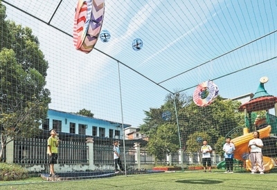 | 航模隊隊員在操場上進行無人機足球?qū)官?。李桂東攝(人民視覺) |