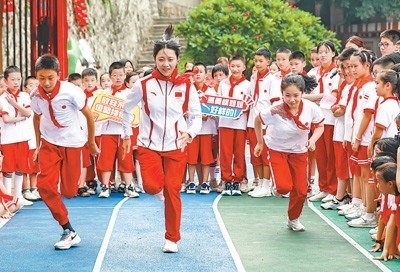 9月1日,福建省福州市鼓樓區(qū)安泰街道烏山小學(xué),田徑運動員葛曼棋(中)正在示范跑步動作技巧。謝貴明攝(影像中國)