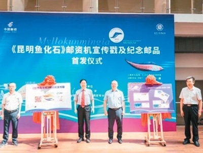 2023年5月,《昆明魚化石》郵資機宣傳戳及系列紀(jì)念郵品在西北大學(xué)博物館首發(fā)。此次啟用的《昆明魚化石》郵資機宣傳戳,是以中國科學(xué)院院士、西北大學(xué)教授舒德干團隊發(fā)現(xiàn)的鳳姣昆明魚化石為原型設(shè)計制作。鳳姣昆明魚距今已5.18億年,是已知最古老的脊椎動物。該魚的發(fā)現(xiàn),為揭示寒武紀(jì)大爆發(fā)奧秘、破解遠古生命演化謎團提供了獨特的劃時代里程碑證據(jù)。圖為首發(fā)儀式現(xiàn)場。中新社發(fā)