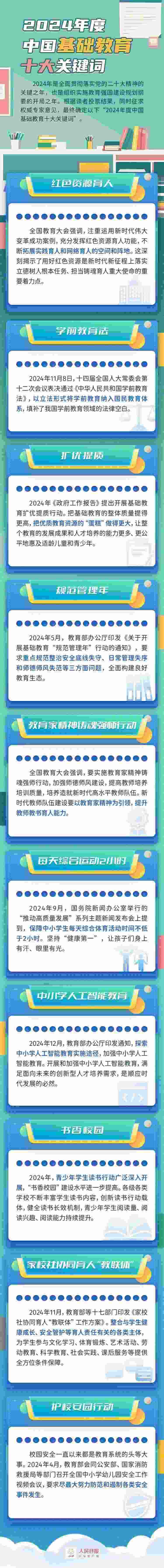 教育興則國家興,教育強(qiáng)則國家強(qiáng)。建設(shè)教育強(qiáng)國,基點(diǎn)在基礎(chǔ)教育。2024年是組織實(shí)施教育強(qiáng)國建設(shè)規(guī)劃綱要的開局之年。這一年來,中國基礎(chǔ)教育領(lǐng)域在深化綜合改革、加快推進(jìn)高質(zhì)量發(fā)展的道路上奮勇向前,不斷增強(qiáng)人民群眾的教育獲得感、幸福感、安全感,繼續(xù)答好“強(qiáng)國建設(shè)、教育何為”的時代課題。在教育部基礎(chǔ)教育司指導(dǎo)下,人民日報少年客戶端推出《揭曉!2024年中國基礎(chǔ)教育十大關(guān)鍵詞》圖解,讓我們一起關(guān)注。
