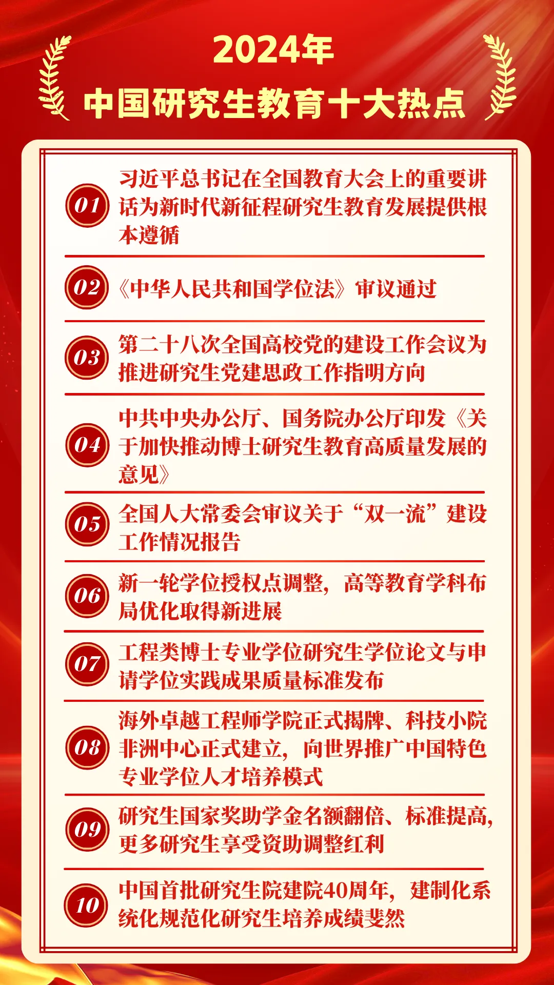 2024年,是中國學(xué)位與研究生教育發(fā)展史上具有重要里程碑意義的一年,在教育部學(xué)位管理與研究生教育司指導(dǎo)下,教育部學(xué)位與研究生教育發(fā)展中心《中國研究生》雜志回顧總結(jié)全年研究生教育大事要事和熱點動態(tài),聯(lián)合人民網(wǎng)、新華網(wǎng)、中國教育報和有關(guān)研究生教育媒體等共同發(fā)布2024年中國研究生教育十大熱點。