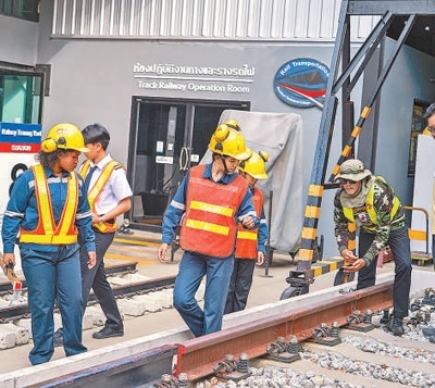 泰國春武里技術(shù)學(xué)院與中國多所鐵道學(xué)院保持技術(shù)交流。圖為軌道專業(yè)的學(xué)生們進行實操訓(xùn)練。