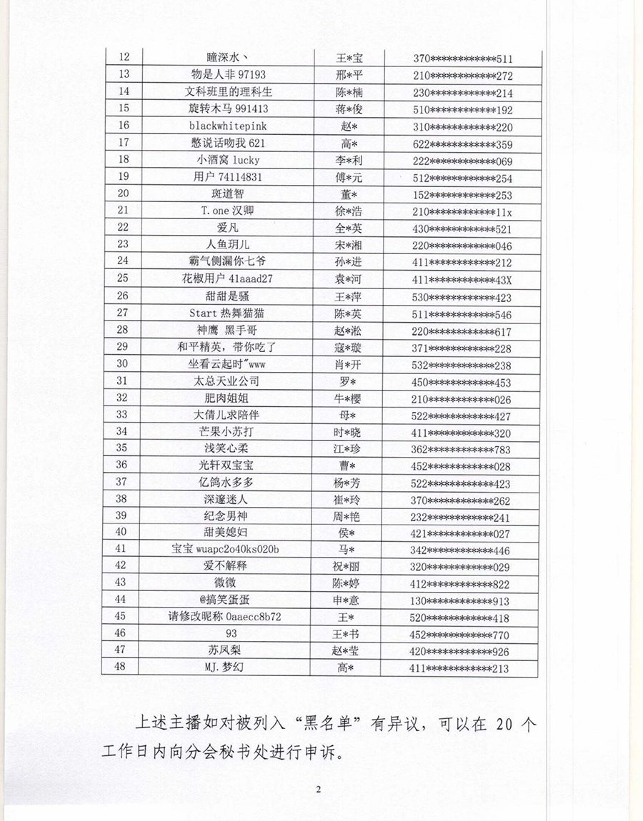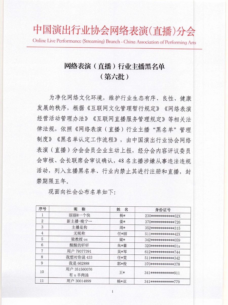 根據(jù)《互聯(lián)網(wǎng)文化管理暫行規(guī)定》《網(wǎng)絡(luò)表演經(jīng)營活動(dòng)管理辦法》《互聯(lián)網(wǎng)直播服務(wù)管理規(guī)定》等相關(guān)法律法規(guī),按照《網(wǎng)絡(luò)表演(直播)行業(yè)主播“黑名單”管理制度》《黑名單認(rèn)定工作流程》規(guī)定,中國演出行業(yè)協(xié)會(huì)網(wǎng)絡(luò)表演(直播)分會(huì)現(xiàn)向社會(huì)公布第六批主播黑名單,被列入黑名單的主播將在行業(yè)內(nèi)禁止注冊和直播,封禁期限5年。(總臺(tái)央視記者曹巖)