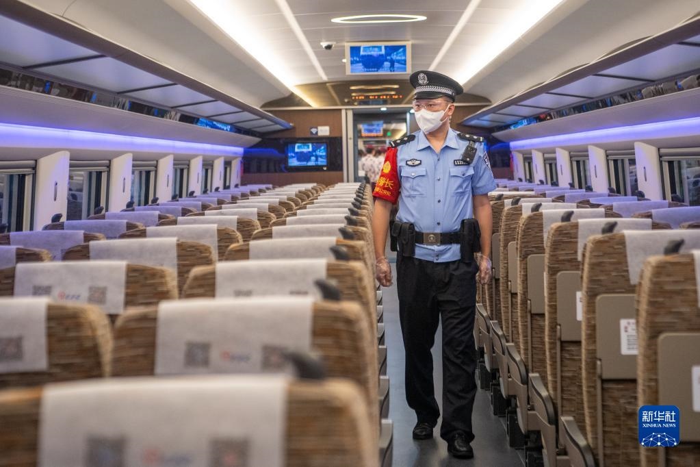 6月19日,鐵路公安在首發(fā)列車CR400AF復興號動車組上進行巡檢作業(yè)。新華社記者 唐奕 攝