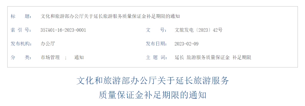 文化和旅游部辦公廳日前發(fā)布通知延長旅游服務質(zhì)量保證金補足期限。通知提出,按照《文化和旅游部辦公廳關于進一步調(diào)整暫退旅游服務質(zhì)量保證金相關政策的通知》(文旅發(fā)電〔2022〕61號)要求享受暫退或暫緩交納保證金政策的旅行社,補足保證金期限延至2024年3月31日。