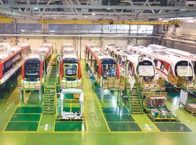 2023年2月14日,湖南省中車株洲電力機車有限公司城軌事業(yè)部總成車間,技術人員在加緊組裝城軌車輛,趕制國內(nèi)外客戶訂單。李 健攝(人民圖片)
