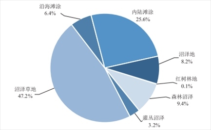 2022年度全國國土變更調(diào)查初步匯總結(jié)果顯示,全國共有濕地2357.3萬公頃。其中,紅樹林地2.9萬公頃,森林沼澤220.7萬公頃,灌叢沼澤75.4萬公頃,沼澤草地1112.9萬公頃,沿海灘涂149.9萬公頃,內(nèi)陸灘涂602.4萬公頃,沼澤地193.2萬公頃。