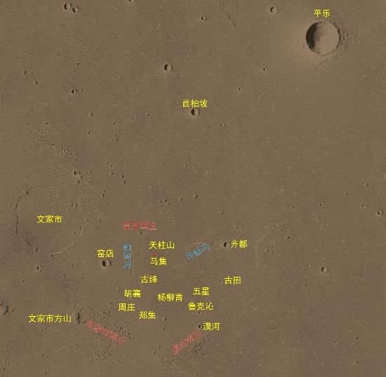 科學(xué)研究團隊通過火星高分影像,識別了著陸點附近大量的地理實體,國際天文聯(lián)合會根據(jù)相關(guān)規(guī)則,將其中的22個地理實體,以中國人口數(shù)小于10萬的歷史文化名村名鎮(zhèn)加以命名。將中國標識永久刻印在火星大地。