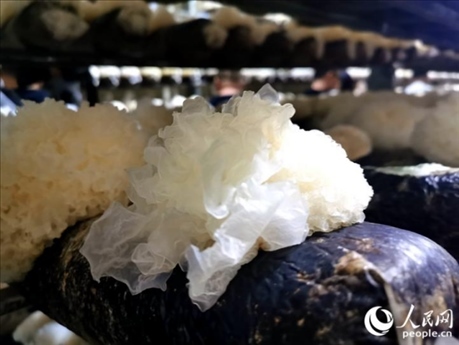 在福建省寧德市古田縣大橋鎮(zhèn)的一處標(biāo)準(zhǔn)化銀耳菇房,一個個整齊排列的架子上,培養(yǎng)基中長出一朵朵晶瑩的“白花”。由于銀耳需要避光、溫暖的生長環(huán)境,溫控智能化設(shè)備通過霧化、控溫等多項(xiàng)功能,模擬出銀耳在野生環(huán)境的生長條件。