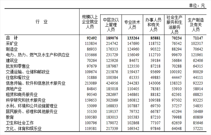 2022年全國(guó)規(guī)模以上企業(yè)就業(yè)人員年平均工資為92492元,比上年名義增長(zhǎng)5.0%。其中,中層及以上管理人員189076元,增長(zhǎng)4.7%;專業(yè)技術(shù)人員133264元,增長(zhǎng)6.6%;辦事人員和有關(guān)人員85881元,增長(zhǎng)4.1%;社會(huì)生產(chǎn)服務(wù)和生活服務(wù)人員70234元,增長(zhǎng)3.3%;生產(chǎn)制造及有關(guān)人員71147元,增長(zhǎng)3.9%。