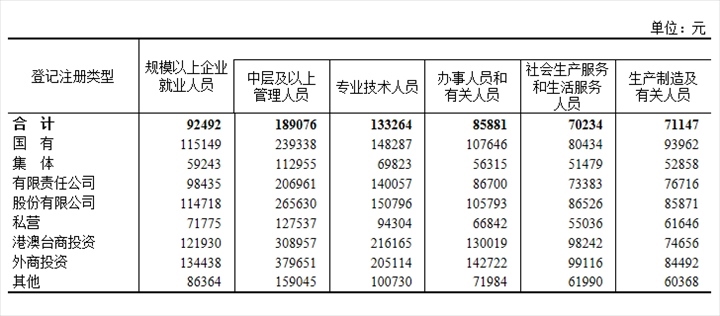 2022年分登記注冊(cè)類型分崗位就業(yè)人員年平均工資。圖片來(lái)源:國(guó)家統(tǒng)計(jì)局官網(wǎng)