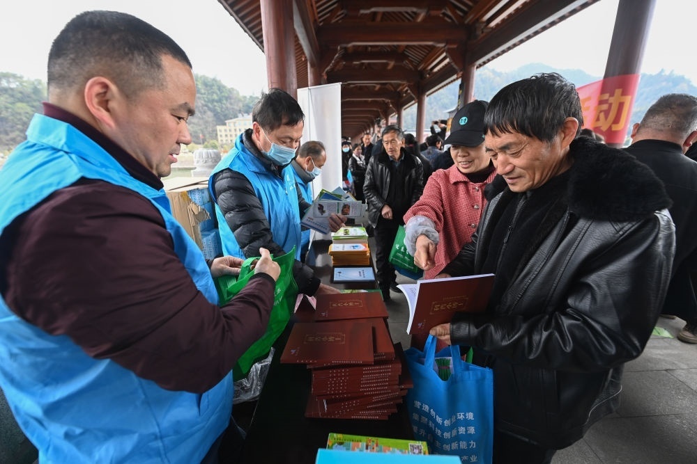 在杭州市臨安區(qū)昌化鎮(zhèn)舉行的春季文化科技衛(wèi)生“三下鄉(xiāng)”服務(wù)活動上,臨安區(qū)科學(xué)技術(shù)協(xié)會“三服務(wù)”小分隊的黨員志愿者將科普書籍贈送給當(dāng)?shù)厝罕姡?023年2月22日攝)。新華社記者 徐昱 攝