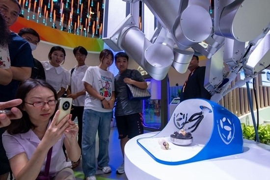 9月2日,在服務(wù)貿(mào)易及服務(wù)業(yè)擴大開放成就展上,手術(shù)機器人吸引了眾多觀眾駐足。人民網(wǎng)記者 翁奇羽攝