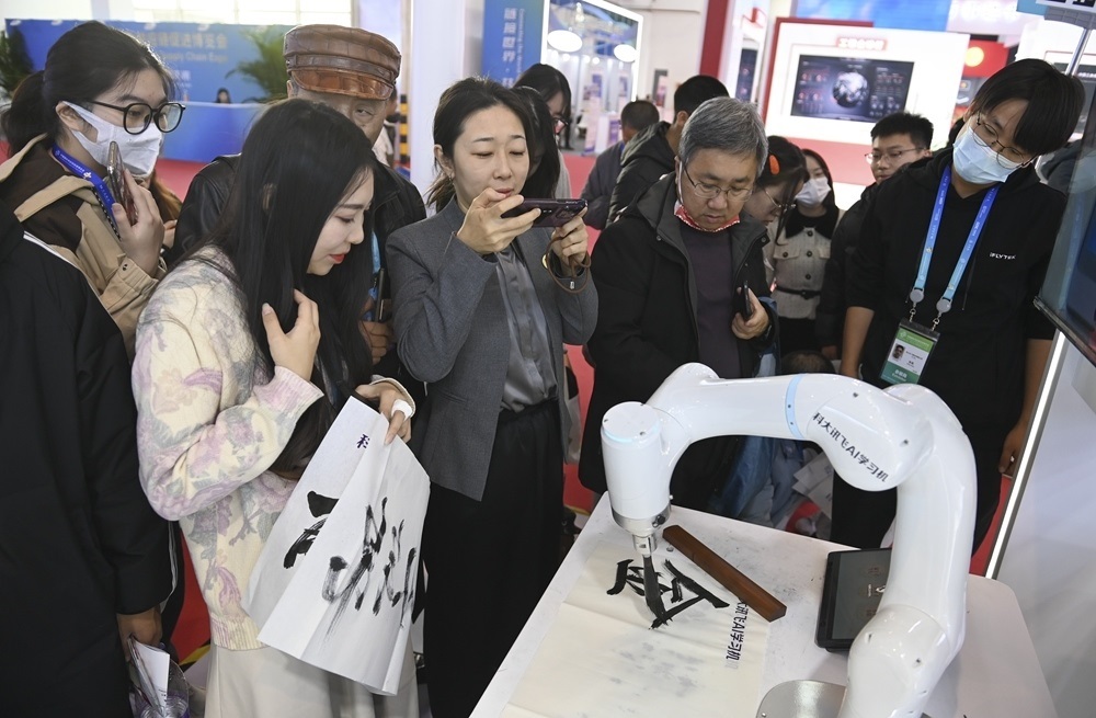 參觀者在首屆中國國際供應(yīng)鏈促進博覽會數(shù)字科技鏈展區(qū)科大訊飛展位觀看一款AI書法機器人寫毛筆字(2023年12月2日攝)。新華社記者 蔡湘鑫 攝