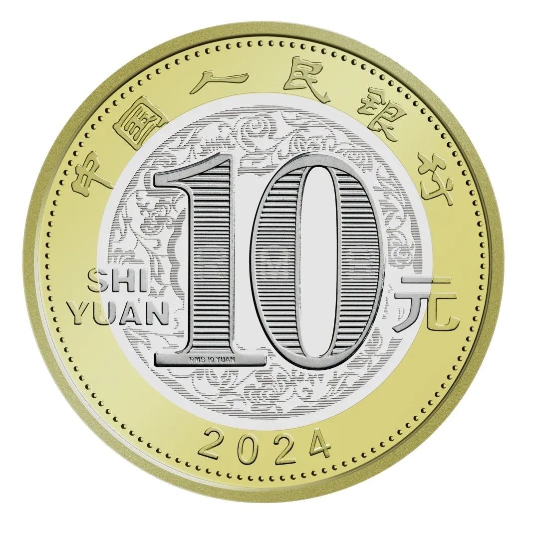 雙色銅合金紀(jì)念幣正面圖案為“中國人民銀行”、“10元”字樣,漢語拼音字母“SHIYUAN”及年號(hào)“2024”,底紋襯以團(tuán)花圖案。