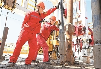 在山東省東營市勝利油田利斜856鉆井現(xiàn)場,勝利石油工程公司渤海50691鉆井隊(duì)員工進(jìn)行起下鉆施工,加快石油勘探開發(fā)步伐。王國章攝(人民視覺)
