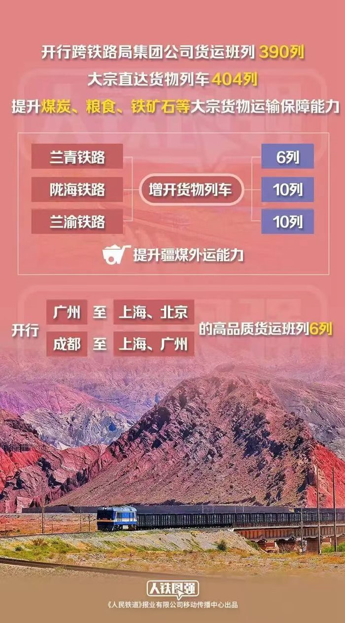 貨運(yùn)方面,鐵路部門統(tǒng)籌運(yùn)用線路、場(chǎng)站資源,安排開行跨鐵路局集團(tuán)公司貨運(yùn)班列390列,大宗直達(dá)貨物列車404列,提升煤炭、糧食、鐵礦石等大宗貨物運(yùn)輸保障能力,為冬季能源保供和國(guó)民經(jīng)濟(jì)平穩(wěn)運(yùn)行提供有力支撐。其中,優(yōu)化調(diào)整蘭州鐵路樞紐列車運(yùn)行方案,蘭青、隴海、蘭渝鐵路分別增開貨物列車6列、10列、10列,提升疆煤外運(yùn)能力。適應(yīng)貨運(yùn)市場(chǎng)需求,優(yōu)化貨運(yùn)班列產(chǎn)品供給,開行廣州至上海、北京,成都至上海、廣州的高品質(zhì)貨運(yùn)班列6列,串聯(lián)京津冀、長(zhǎng)三角、粵港澳大灣區(qū)、成渝地區(qū)等主要經(jīng)濟(jì)區(qū)域,打造快捷物流產(chǎn)品示范線。