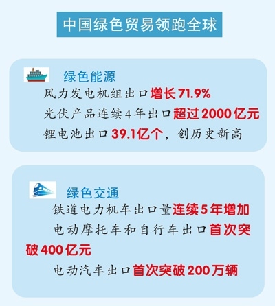 風力發(fā)電機組出口增長超七成;光伏產(chǎn)品連續(xù)4年出口超2000億元;鋰電池出口創(chuàng)歷史新高……海關(guān)總署新聞發(fā)言人、統(tǒng)計分析司司長呂大良表示,2024年,中國綠色貿(mào)易領(lǐng)跑全球。中國綠色產(chǎn)品不僅豐富了全球供給,也為全球應(yīng)對氣候變化和綠色低碳轉(zhuǎn)型作出了巨大貢獻。