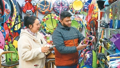 浙江義烏國(guó)際商貿(mào)城一家戶外滑雪用具店鋪內(nèi),外商在洽談、選購(gòu)戶外冰雪運(yùn)動(dòng)裝備。
