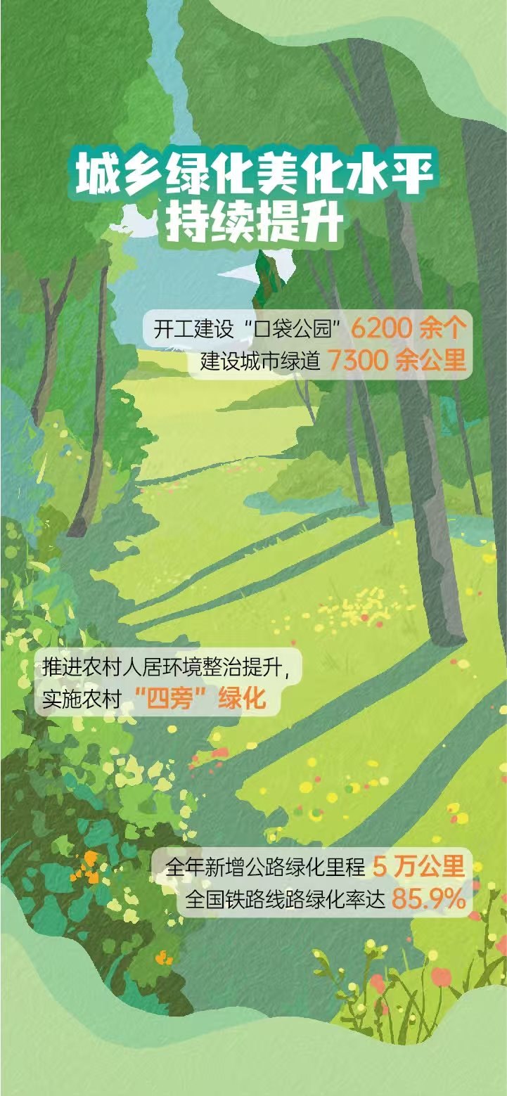 張利明介紹,過去一年,山水林田湖草沙系統(tǒng)治理取得新進展,城鄉(xiāng)綠化美化水平持續(xù)提升。組織實施176個“雙重”工程項目、10個國土綠化示范項目。推進實施“十四五”27個山水林田湖草沙一體化保護和修復(fù)工程項目、49個歷史遺留廢棄礦山生態(tài)修復(fù)示范工程項目。森林可持續(xù)經(jīng)營實施面積擴大到66.7萬公頃以上。全國林草碳匯試點市(縣)和國有林場碳匯試點實施面積達6.8萬公頃。新增水土流失治理面積6.4萬平方公里。開工建設(shè)“口袋公園”6200余個,建設(shè)城市綠道7300余公里。新增公路綠化里程5萬公里,全國鐵路線路綠化率達85.9%。